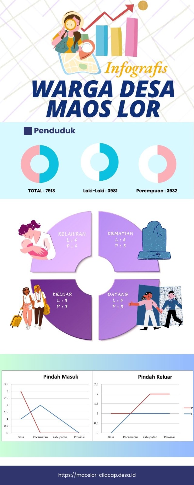 Pemerintah desa menyajikan data kependudukan agar mudah dibaca dan dipahami oleh masyarakat yang melihatnya. Infografis tersebut meliputi data kependudukan mulai dari jumlah penduduk Maos Lor baik laki - laki maupun perempuan. Jumlah kelahiran, kematian, pindah datang dan pindah keluar.